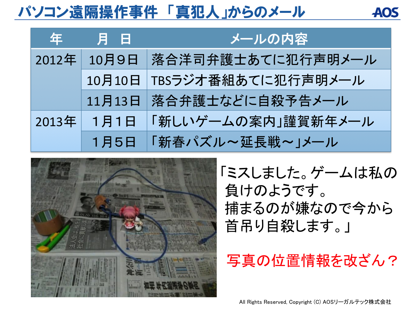 それらのメールの内容を元に警察が捜索を行ったところ,多摩にある雲取山でUSBメモリー,江の島でトロイの木馬のソースコードが入った記録媒体(SDカード)が発見される。 - ●2013年2月