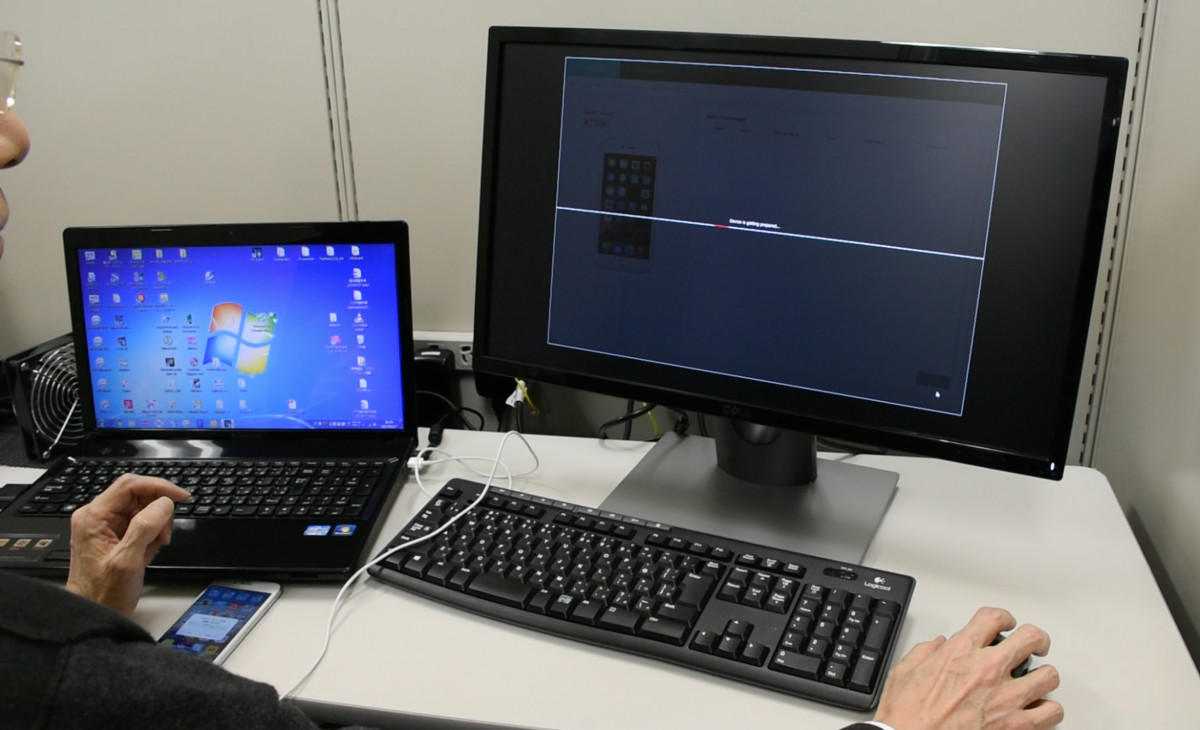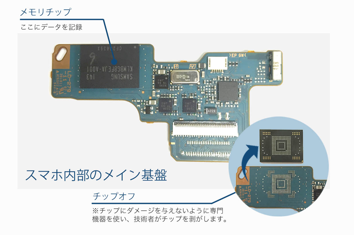 スマホのメモリチップを剥がし、データ読み出しツールを用いて、データを抽出します。