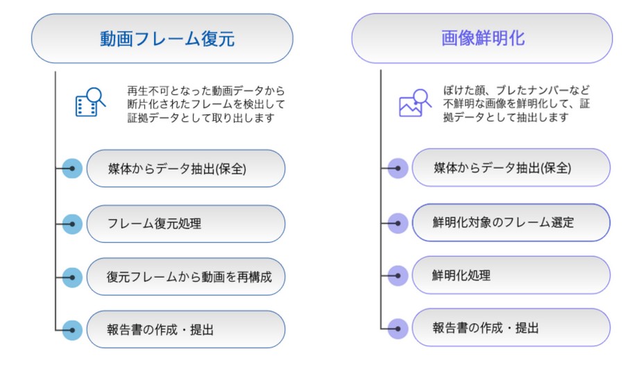 AOS Data社のドライブレコーダーフォレンジックは、破損したドライブレコーダーの動画データを復元して、再生可能にする動画フレーム復元と、ブレた画像、ぼけた画像を鮮明化する画像鮮明化の2つのサービスメニューがあります。