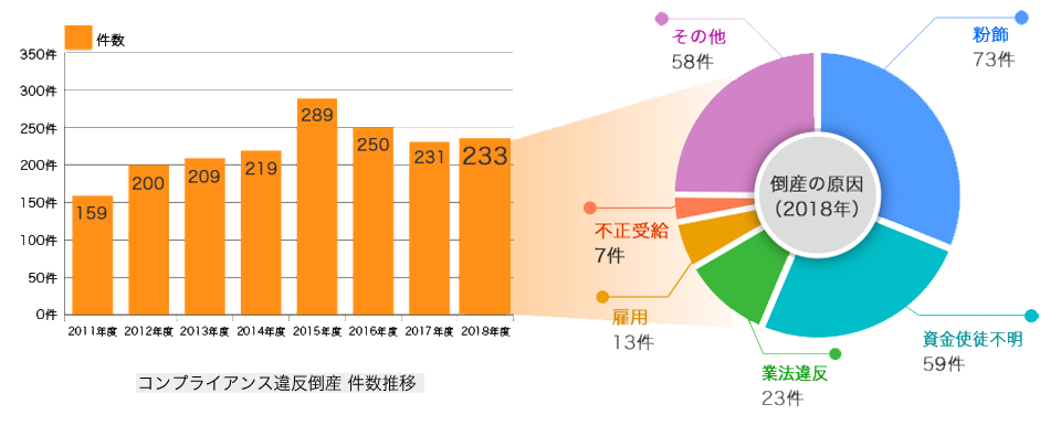 帝国データバンクによると、2018年にコンプライアンス違反で倒産した企業は、233社で、粉飾が原因で倒産した企業は、73件(31.3%)、資金使徒不明が原因で倒産した企業は、59件(25.3%)に上るとのことです。