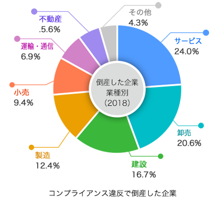 コンプライアンス違反で倒産した企業を業種別に見ると、2018年で最も多かったのは、サービス業で56社(構成比24.0%)で卸売業が48社(構成比20.6%)、建設が39社(構成比16.7%)などとなっています。
