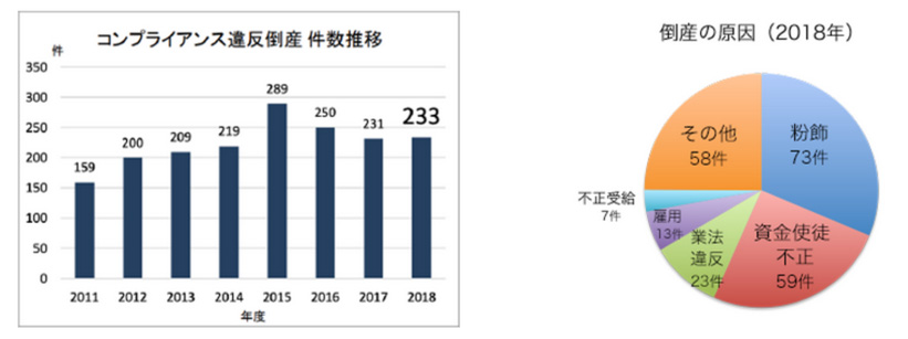帝国データバンクによると、2018年にコンプライアンス違反で倒産した企業は、233社で、粉飾が原因で倒産した企業は、73件(31.3%)、資金使徒不正が原因で倒産した企業は、59件(25.3%)に上るとのことです。