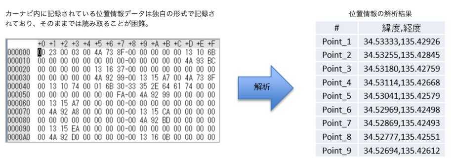 メーカー、モデルによってデータの記録方法は様々です。自動車フォレンジックではデータの記録場所、記録形式を解析、特定し目的の情報を抽出します。