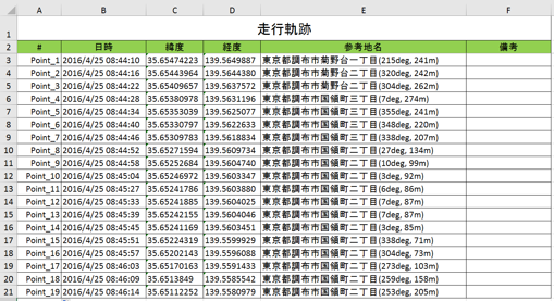 走行軌跡などの抽出情報は非常に膨大な量となります。絞り込みや検索ができるようExcelに一覧で出力します。特に位置情報は数値で起票され直観的に分かり難いため、国土地理院の全国位置情報を参考情報として付記します。