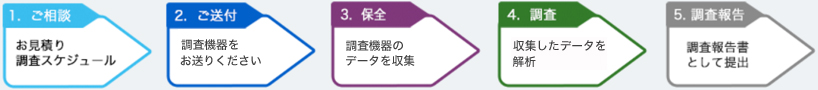 調査機器が弊社に到着いたしましたら、調査機器より記憶媒体(HDD等)を取出します。この際、調査機器を解体する場合があります。記憶媒体中のデータの証拠性を損なわないように、記憶媒体に記録されているデータを保全(全体または必要箇所を収集)します。この際、記録媒体にセキュリティ(パスワードロック)がかかっている場合には弊社にて解除させて頂きます。