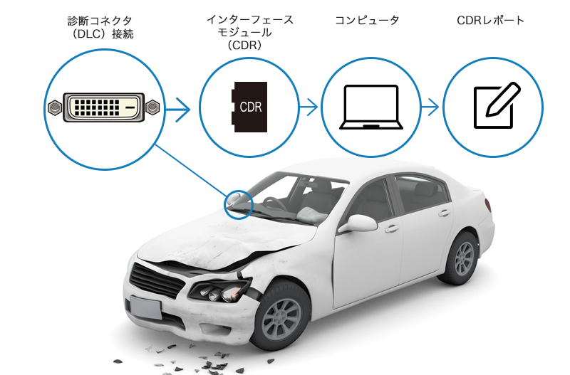 クラッシュデータリトリーバル(CDR)は、イベントデータレコーダー(EDR)に保存されたデータを読み出し、クラッシュ情報をCDRレポートの形式で出力します。 CDRレポートは、民事事件、刑事事件で証拠資料として法廷に提出されています。